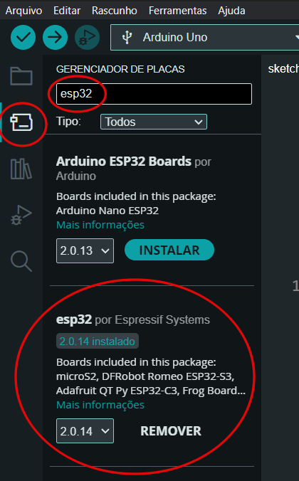 Com a URL adicionada, é hora de instalar o pacote do ESP32 no Arduino. Para isso, vá em “Gerenciador de Placas”, pesquise por “ESP32” e instale a placa esp32 da desenvolvedora Espressif