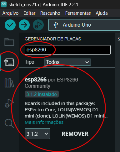Com a URL adicionada, é hora de instalar o pacote do ESP32 no Arduino. Para isso, vá em “Gerenciador de Placas”, pesquise por “ESP8266” e instale a placa esp32 da desenvolvedora ESP8266 Community